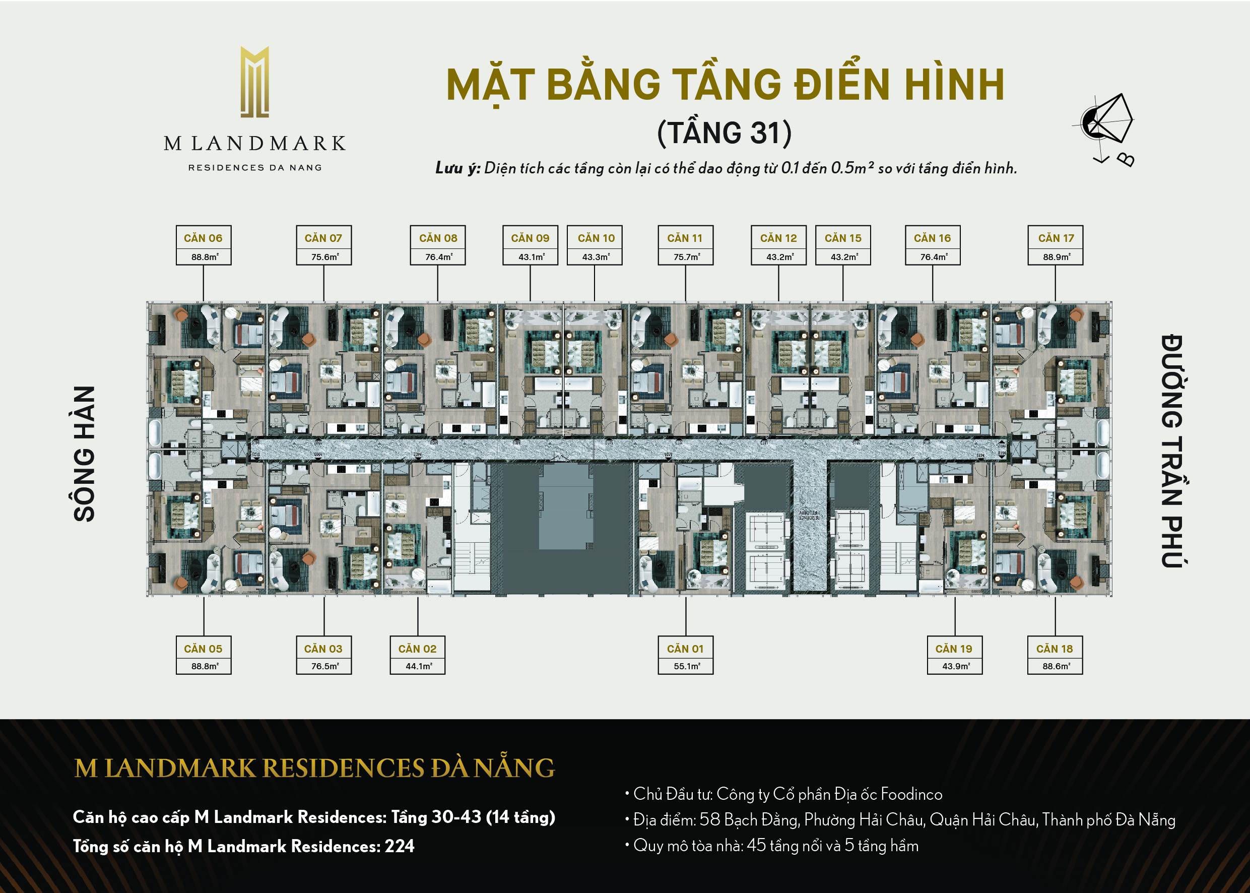 | Tổng số sản phẩm | 224 căn hộ (tầng 30 đến 44) + 288 condotel |